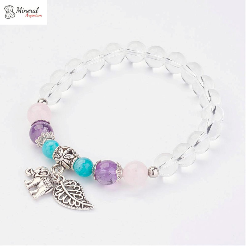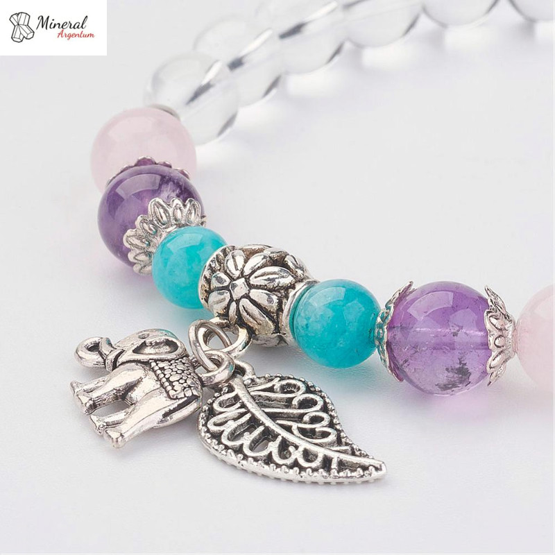 Minerální náramek z křišťálu, růženínu, ametystu a amazonitu.